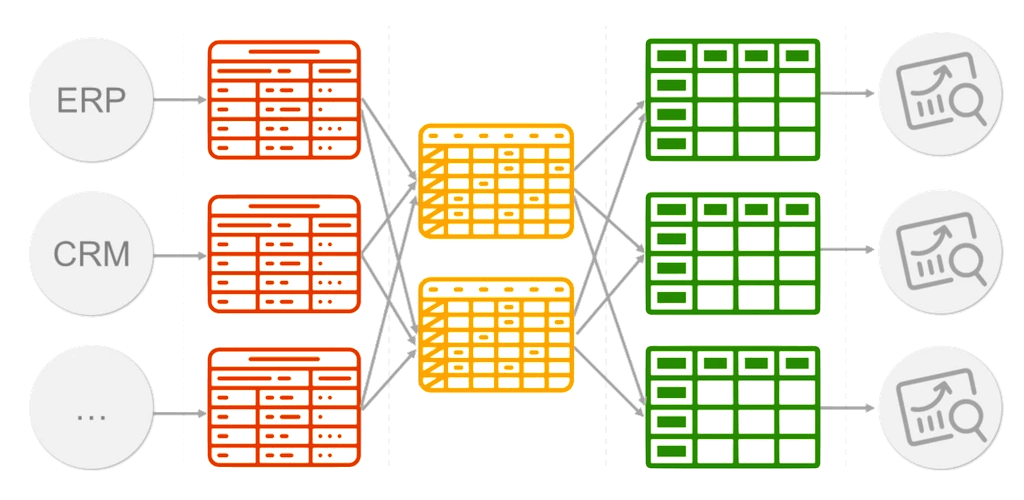 Работу DWH можно представить в виде конвейера, на вход которого подают "замусоренные" и разрозненные данные из различных информационных систем, а на выходе получают "красивые" таблицы.